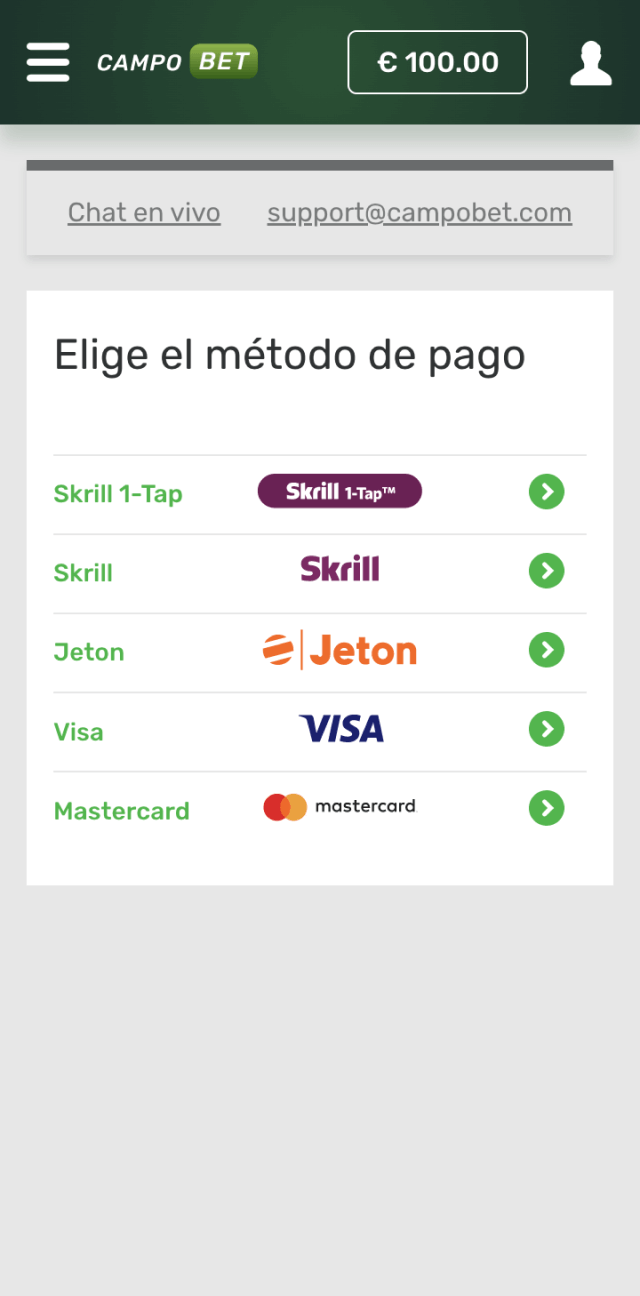 Para recibir este bono de casino de CampoBet, debe registrarse y realizar su primer depósito. Después de completar el registro, haga clic en el campo de moneda en la esquina superior derecha y elija su método de pago preferido. El monto mínimo de depósito puede variar con el tiempo, por lo que es mejor verificarlo en la sección de Términos y Condiciones.