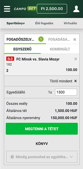A következő lépés elkezdeni kötni online. A bónusz megszerzéséhez legalább egyszer el kell költened az első befizetésed teljes összegét. Egyszeri vagy kombinált fogadásokat köthetsz különféle sportágakra, minimum 1,50-es szorzóval.