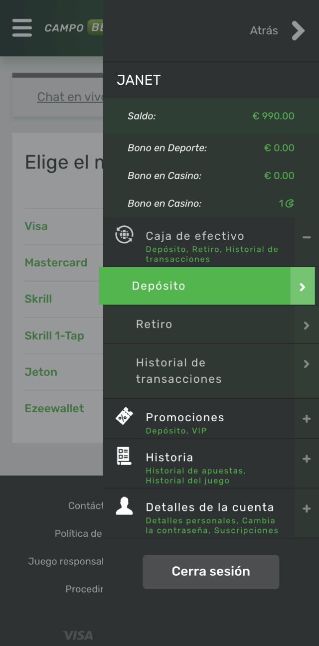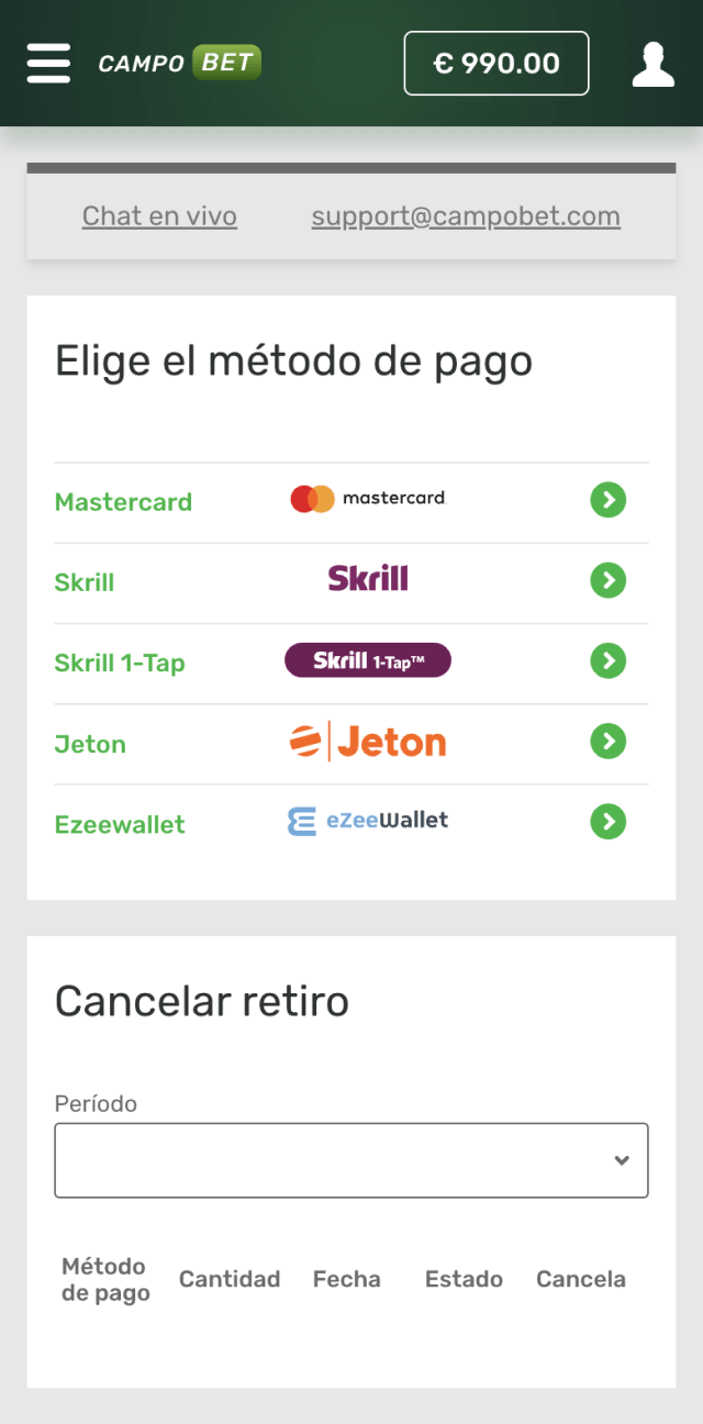 Independientemente de la página de casino de CampoBet en la que se encuentre actualmente, puede acceder a su saldo en cualquier momento haciendo clic en el signo correspondiente que se muestra en la esquina superior derecha de la pantalla. Llegará a una página con todos sus detalles financieros. Aquí podrás realizar todo tipo de operaciones de dinero, incluyendo depósitos y retiros.